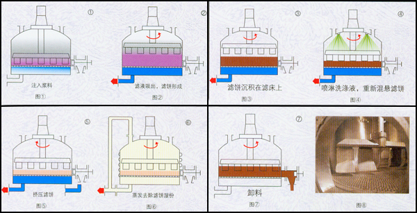 6、清洗徹底:由于此設(shè)備具有自動(dòng)噴淋和重新打漿的功能,濾餅可以得到非常徹底的清洗。并且洗滌液用量較其它類型設(shè)備少,可減少排污量和降低廢水處理費(fèi)用。